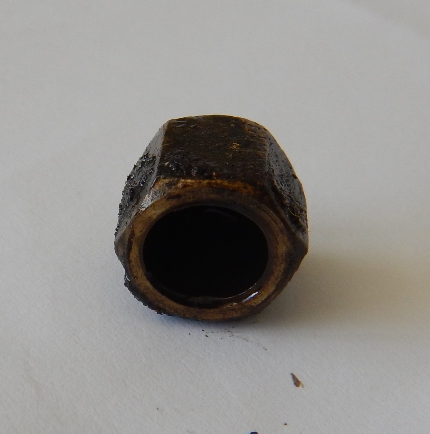 Brass nut that fits over the drain hole on the right hand side of the Engine/Sump Base. > It looks like it's had a lot of spanners on it over the years - lots of little nicks and bumps etc - but that's good news really - it tells me the engine has had lots and lots of oil changes over the years - and I don't know about you - but I think if the only maintenance you ever do to an engine is change the oil every couple of mponths - it will always be good to you And the proof is in the pudding, so to speak - when you examine the insides of this engine, so you see the benefits of regular oil changes. I suspect a lot of the linear gouges you can see were my fault - I cleaned this with a wire brush on my rotary tool - and I think the wire brush was harder than the Brass Nut, so it gouged out those lines you can see. I have now ordered a bunch of little brass wire wheels so it won't happen again. |