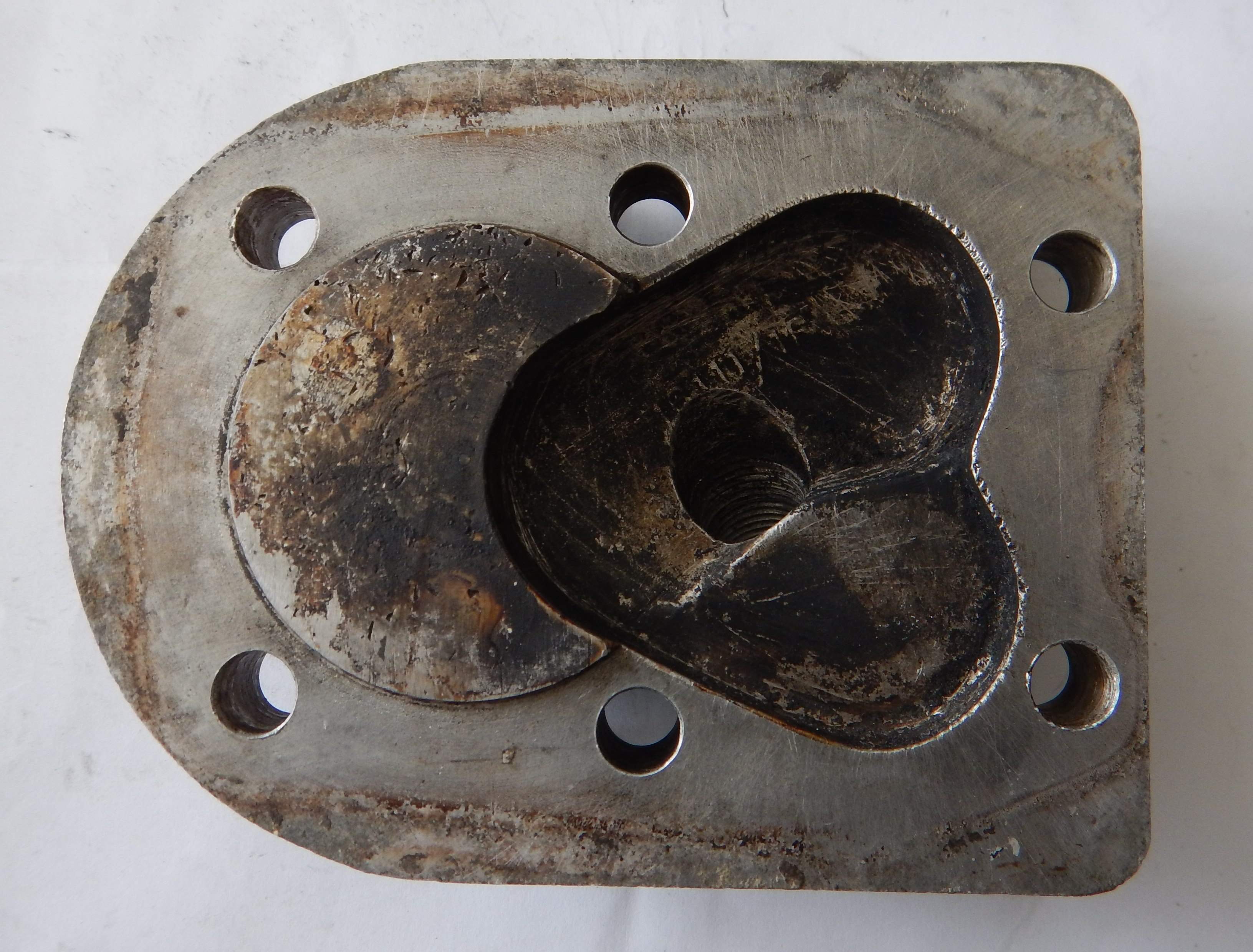 As you can see from the photos below - I had started to clean this up prior to taking the "Before" photos. I just wanted to see what it would come up like. The process for cleaning thios was - Degreaser - Degreaser - More Degreaser - Wash in soapy water and get it as clean as I possibly could. Then, start of with coarse sandpaper - which for me was about 360 grit Wet & Dry - sand sand and sand. Then 400 grit Wet & Dry - sand, sand and sand. Then 600 grit Wet & Dry - sand, sand and sand. Then 800 grit Wet & Dry - sand, sand and sand. Then 1000 grit Wet & Dry - sand, sand and sand. Then 1200 grit Wet & Dry - sand, sand and sand - and by this time it should be starting to look really good. Then out with the rotary tool and the AutoSol (Metal Polish) and shine it up with that - it will come up like a mirror - of course if you don't want it to have a mirror shine you need to go this far. As for the combusion chamber and the carbon - well - how does one do that - it seems like someone had had the head off and tried to decarbon it with a screwdriver before I got at it. I'm not sure how good an indea that is - but before I start criticizing - I should probably let you know that I don't really know of anything better - some things I've read are Diesel, |