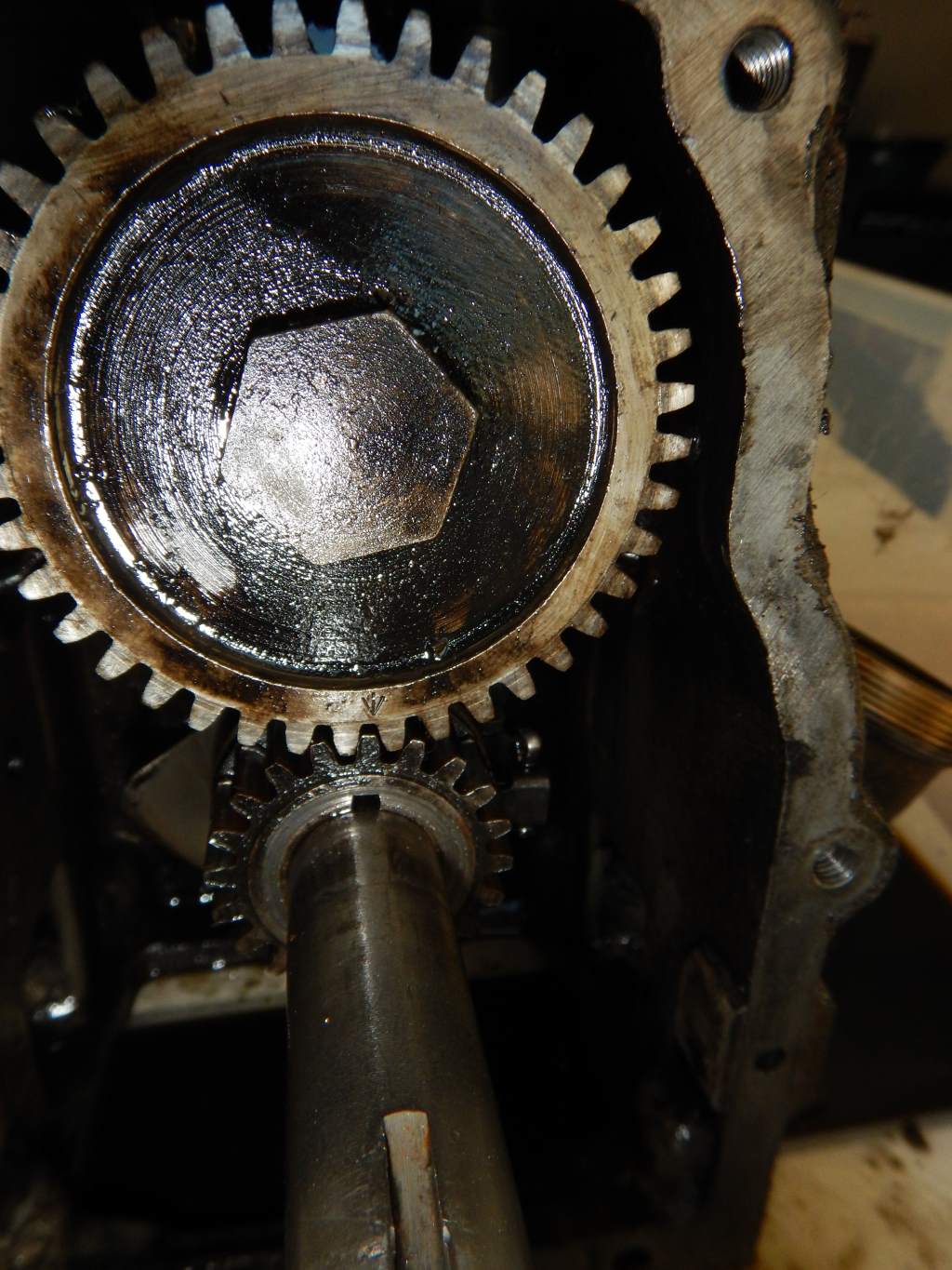 Note the timing marks on the gears (I've got a manual now) - the arrow you can see at 6 o'clock on the large gear - and there is a corresponding one on the smaller gear as well - its much more obvious after the gears were cleaned.