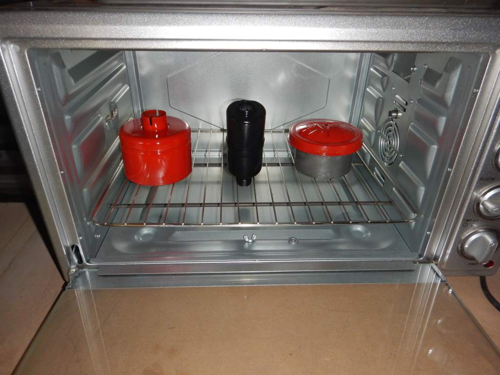 Into the oven for curing. 1 hour at 90 Deg Celcius (200 Deg Farenheit)