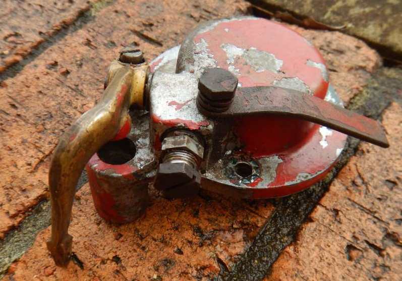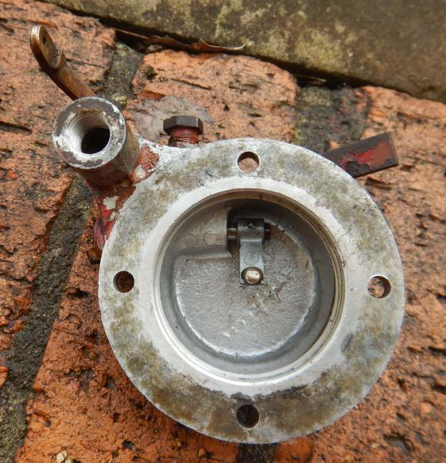 Here's a picture of it still in place on the Engine. This is after the whole engine got a Jet Wash, so it doesn't look too bad, but you can see the Adjuster Screw and Lock Nut are corroded. What you can't feel is they are seized in place and the Oiling Hole in the end is completely filled with gunk. The piston and spring are also seized in place, so the governor arm that adjusts the carburettor doesn't move. All in all, its a gunked up mess internally.