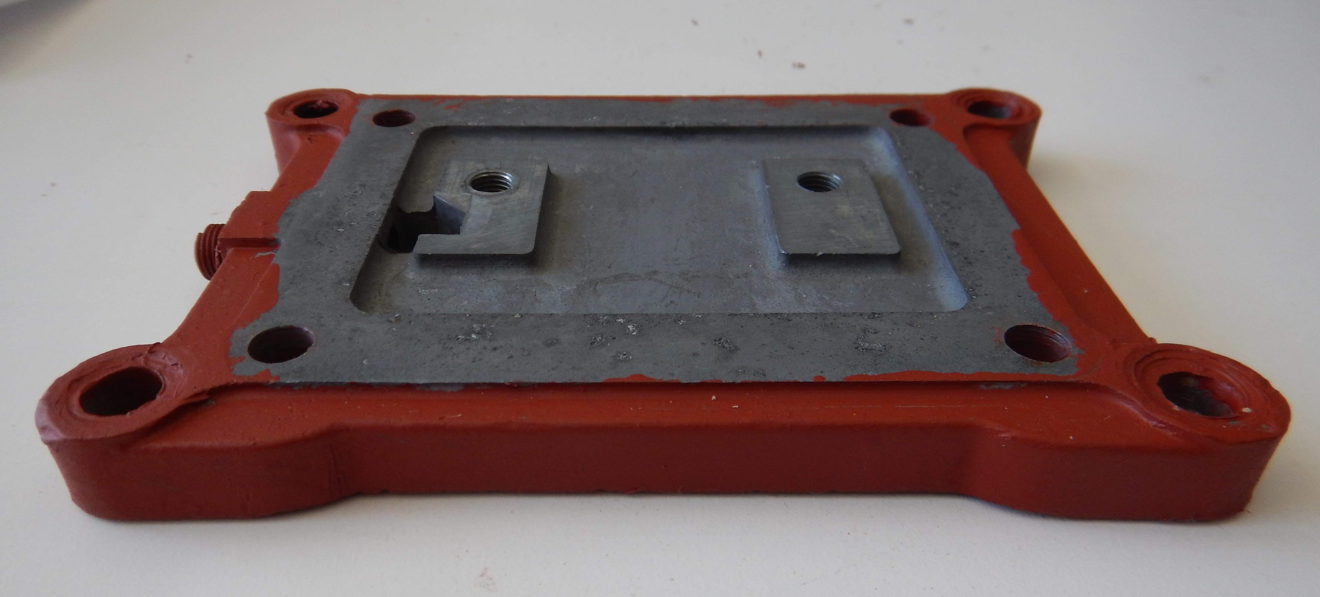 The base on which the engine sits - this is essentially the bottom of the sump. An alloy plate that serves as both the engine base and the bottom of the sump. Internally, the oil trough attaches to this plate via a couple of bolts, you will see the threaded holes for these bolts towards the centre of the base. In all there are 10 threaded holes: