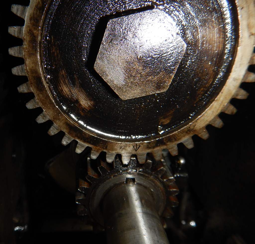 Note the timing marks on the gears (I've got a manual now) - the arrow you can see at 6 o'clock on the large gear - and there is a corresponding one on the smaller gear as well - its much more obvious after the gears were cleaned.