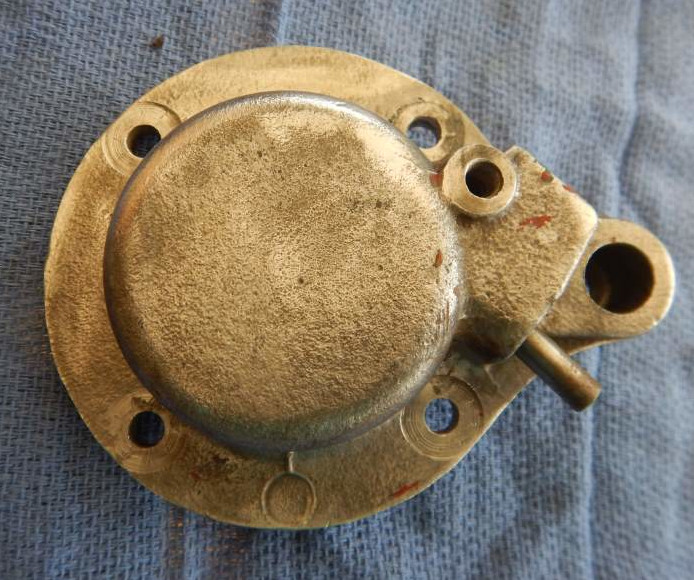 Here's a picture of it still in place on the Engine. This is after the whole engine got a Jet Wash, so it doesn't look too bad, but you can see the Adjuster Screw and Lock Nut are corroded. What you can't feel is they are seized in place and the Oiling Hole in the end is completely filled with gunk. The piston and spring are also seized in place, so the governor arm that adjusts the carburettor doesn't move. All in all, its a gunked up mess internally.